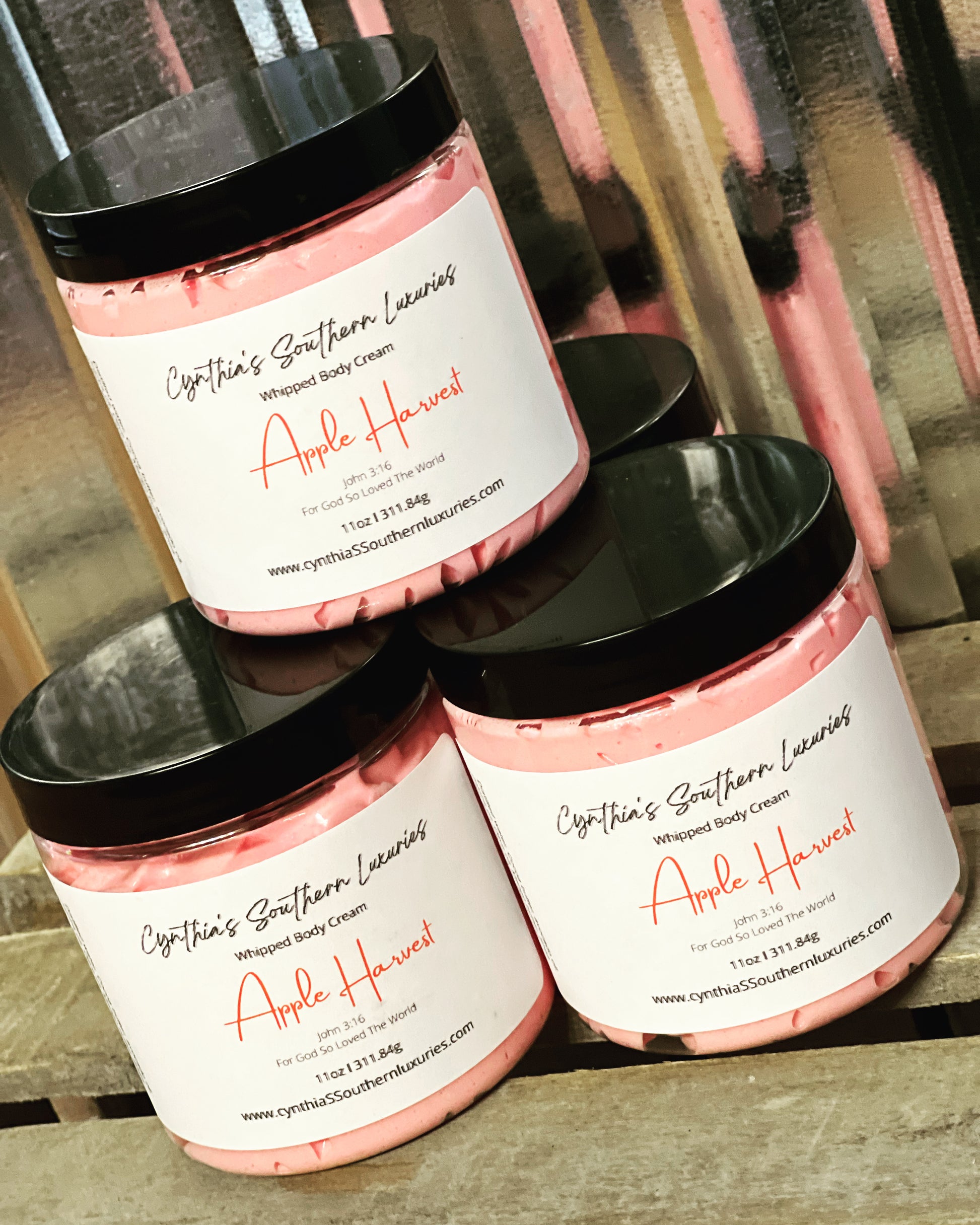 About| After exfoliating with Foaming Butter Scrubs, by Cynthia's Southern Luxuries, show your skin some love by nourishing it with our Whipped Body Cream! Cynthia's Southern Luxuries Just Launched our new line of Body Creams! Our Body creams are a thick creamy moisturizer that leaves your skin silky soft. Our body creams are different from our whipped body butters. Our body creams are water based. They are enriched with jojoba oil, carrot seed oil, sunflower oil, olive oil, avocado oil, and vitamin E known to help regenerate the skin. And yes, they are still enriched with Shea butter, Mango butter, and Cocoa butter. Because these are creams and not body butters, they don't have the greasy feel to them, but do have a sheen.