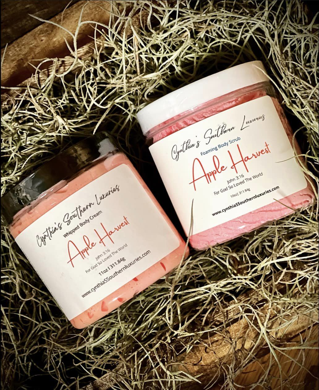 About| The scent of our "Apple Harvest". This foaming sugar scrub exfoliates and lathers up like soap but provides a perfect polish without the oily mess of traditional scrubs. Our fluffy scrub contains Sweet Almond oil to cleanse, exfoliate, and hydrate all at once!
