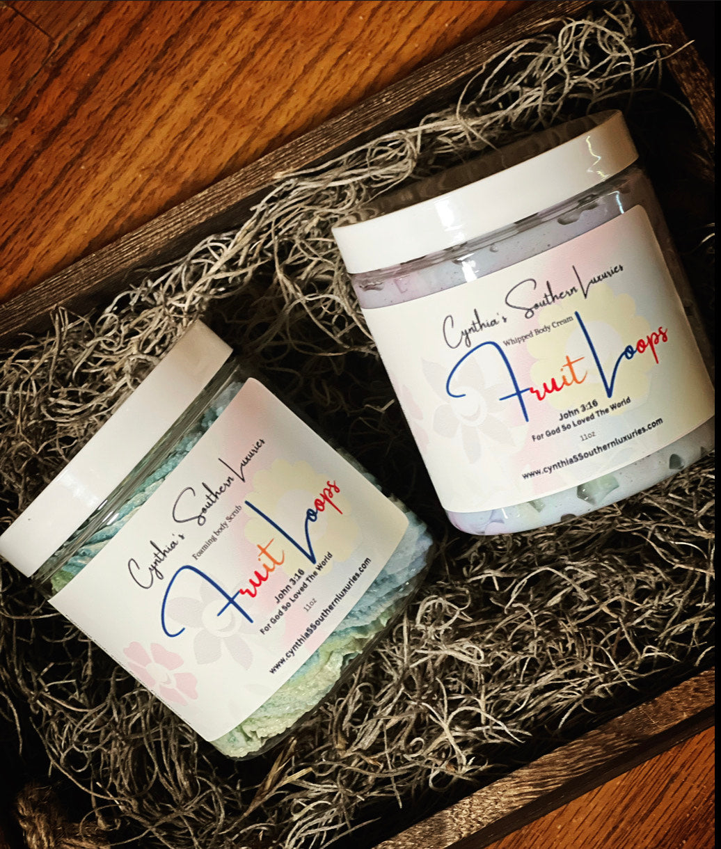 About| Indulge in strong bright scents of refreshing fruit while using our fun" Fruit Loop foaming butter sugar scrub! This foaming sugar scrub exfoliates and lathers up like soap but provides a perfect polish without the oily mess of traditional scrubs. Our fluffy scrub contains Sweet Almond oil to cleanse, exfoliate, and hydrate all at once!